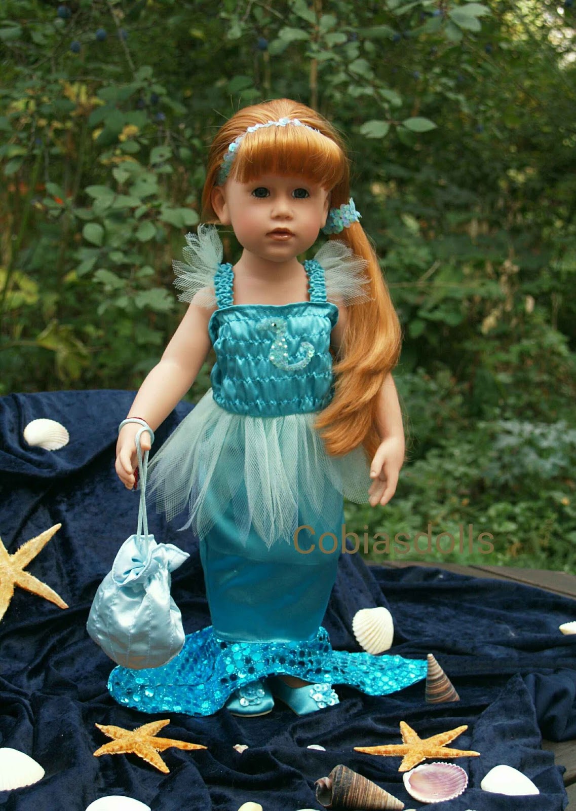She is wearing a wonderful turquoise mermaid dress. Mermaid has got red hair and blue eyes.